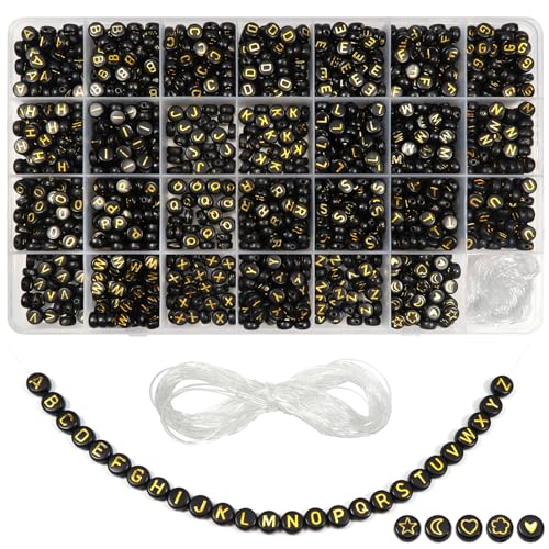 TOAOB 1440 st 7 x 4 mm akryl bokstav alfabet pärlor A till Z svart rund och guld hjärtmönster med 15 mm kristalltråd för DIY armband tillverkning halsband smycken