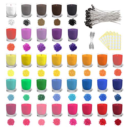 Lzshop-EU 34 Färg Ljusfärg Sojavaxfärgflingor för ljustillverkning Vaxfärgfärg för DIY-ljus 5 g Varje förpackning med 100 ljuspinnar, 100 klistermärken och 1 ljuspinnehållare