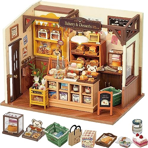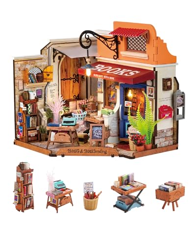 ROBOTIME DIY Gör-det-själv-dockhus-kit trä biblioteks modellsatser byggnad, bokhylla miniatyr hantverks-kit, 1:24 skala bokhandel med möbler och tillbehör pedagogiska leksaker för flickor