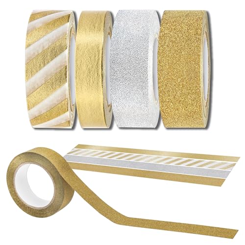 Decoraparty 4 rullar Washi tejp, guld silvertejp dekorativ för presenter, klippning, journaling, DIY, rulle, längd 10 meter (4 st)
