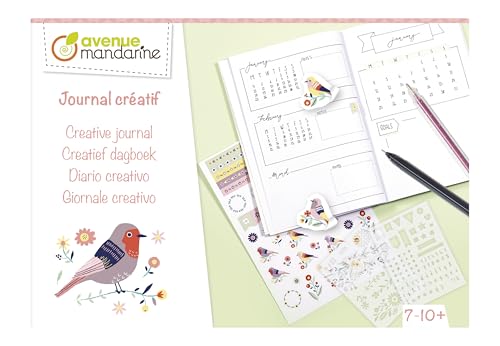 Avenue Mandarine - Boite Journal Créatif - Kit Idéal pour Bullet Journal, Scrapbooking, Loisir Créatif DIY - Carnet + Pochoirs + Feutre Noir + Feutre Pailleté + Planches de stickers - KC108C