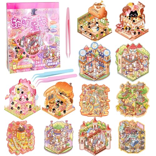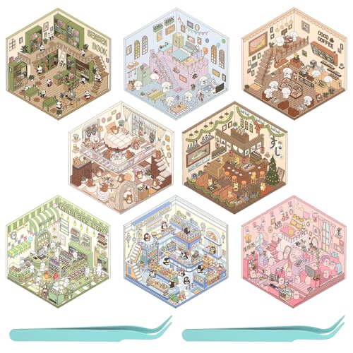 UBERMing 12 uppsättningar 3D-klistermärken Scene Cozy Room Sticker Book med pincett, 3D miniatyr Scene Stickers DIY Café Dessertshop lås, hemmaklistermärken terapy Klistermärken Relief stress för