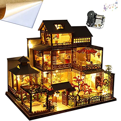 WonDerfulC DIY japansk stil villa scen arkitektonisk modell körsbärsblommor trädgård monterad leksak hus musik hus kit med dammskydd 3D dockhus kreativ present