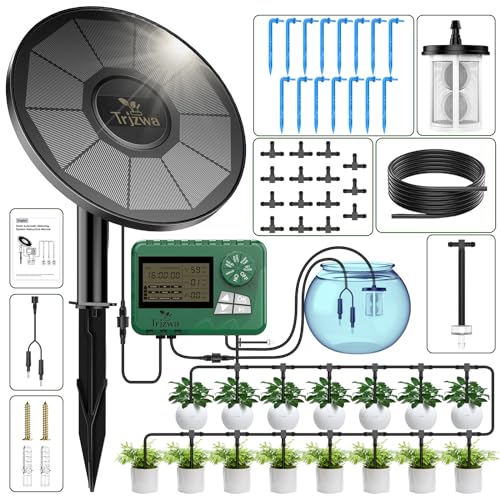 TRJZWA Solar Irrigation System Kit med Tidig Varningsfunktion, DIY Solar Automatic Drip Irrigation Kits, Automatiskt Bevattningssystem med 15m Vattenslang och 15 Droppare för Balkong/Trädgård