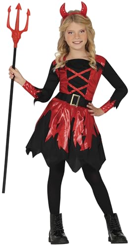 FIESTAS GUIRCA eldig djävul halloweenkostym barn – djävulshorn hårband & röd, glänsande djävulsklänning – kostym barn, halloween, flickor 7–9 år