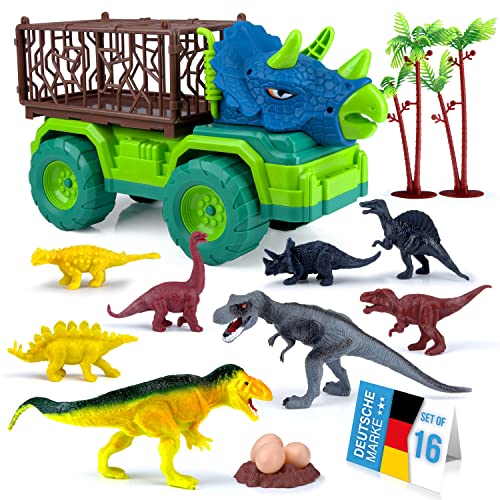 Dino truck dinosauriebil med dinofigurer, lekmatta och tillbehör; lastbil med djurbur, leksaksset för barn från 3 år och uppåt för att fånga dinosaurier. (Dino Set med lastbil)