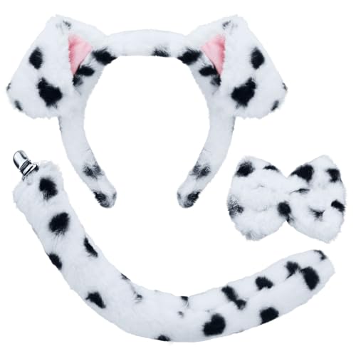 XEPST Dalmatiner djurdräktsset för barn, hundöron och svans med dalmatiskt pannband och hundsvans fluga för djurdräkt Cosplay födelsedag halloween kostymfest