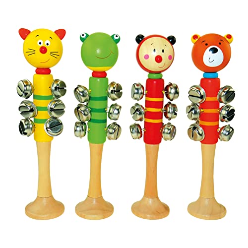 Bino 9086586 Baby Shaker med 9 bjällerklockor och djurhuvud. Rytmiskt musikinstrument för barn i åldern 36 månader och uppåt. The Rattle is 20,5 cm lång, flerfärgad