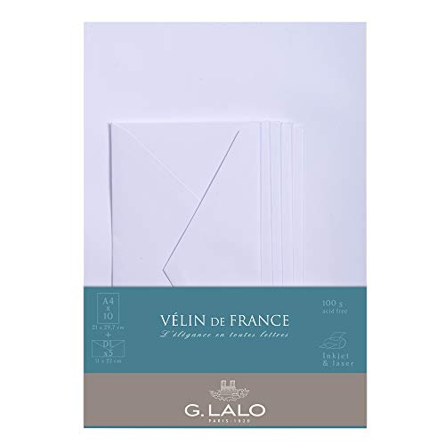 G.Lalo 63000L korrespondensset Vélin de France (med 10 ark DIN A4, 100 g, rak kant och 5 kuvert DL, nässlöjd och fodrat) vit