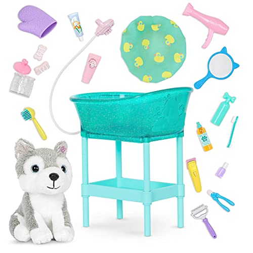 Glitter Girls Docktillbehör – gosedjur hund Husky med djurvårdstillbehörset – tillbehör för 36 cm dockor, gosedjur och dockhus, dockmöbler, leksaker för barn från 3 år