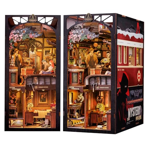 Fsolis Book Nook Kit,dockhus miniatyr huskit med LED-lampor och infällbar dammskyddsplatta, train mystery fodral 3D-pusselbokstöd av trä, kreativa presenter (Train Mystery Case)