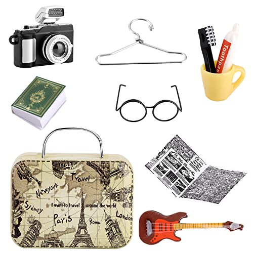 cobee miniatyr dockhus tillbehör, 10 stycken dockhus dekoration, mini resväska set miniatyr trädgård dekoration mini tandkräm tandborste kamera lampa gitarr böcker glasögon tidning klädhängare
