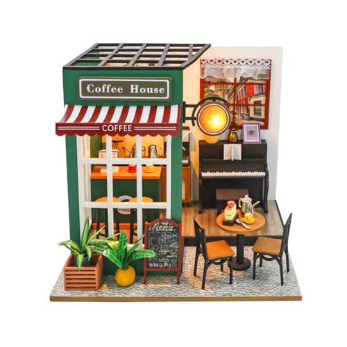 Gör-det-själv dockhus miniatyr kit 1:24 skala kafé med möbler LED-lampor trä café dockhus pusselmodell för tonåringar barn födelsedag present