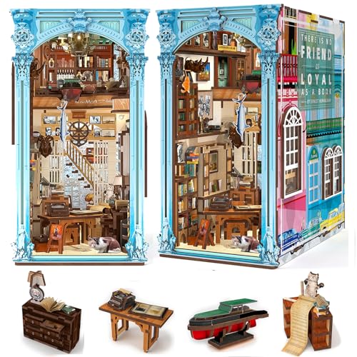 Fsolis DIY Book Nook kit,dockhus miniatyr hus kit med LED-lampor och infällbar dammskyddsplatta, 3D-pusselbokstöd av trä,Booknook kreativa presenter till pojkar och flickor