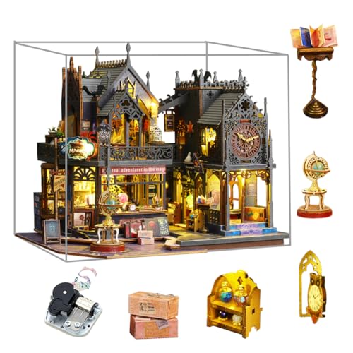 Magiskt dockhus, gör-det-själv-byggsats med miniatyrhus, magiskt slott, pusselleksak med möbler och LED-lampor, kreativ födelsedagspresent till barn och tonåringar (plus dammskydd och speldosa)