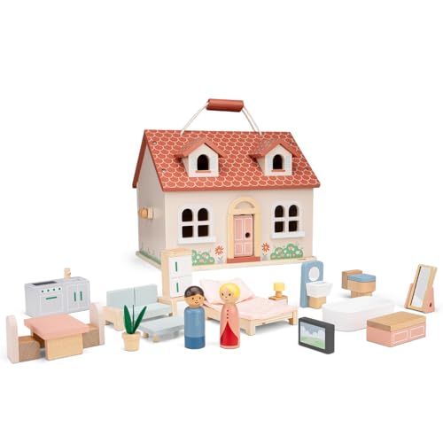 Woet Hopfällbart dockhus i trä för barn - imitationsleksak med 18 möbler och 2 dockor - lätt att bära - från 3 år - flickor och pojkar present
