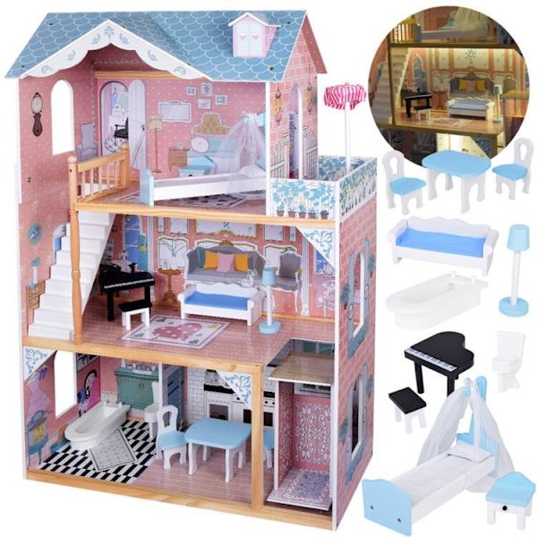 Dockhus i trä med 3 våningar & 10 möbler & 5 rum dockhus drömhus rosa