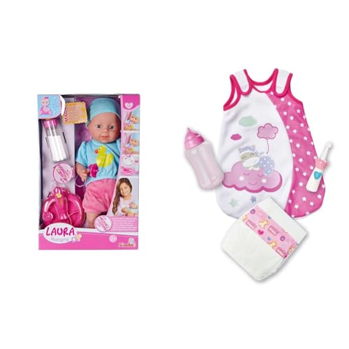 Simba 105010964 – Laura Hungry, mjuk kroppsdocka med napp, magisk sked, från 2 år & Laura Babytillbehör, sovsäck, zanh-borste, blöja, flaska, för 30–38 cm dockor, 4 delar, dockkläder, från 3 år