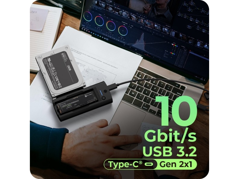 Orico 2-Disk dockningsstation med M.2 NVME 2,5"/3,5 HDD/2,5" SSD klonfunktion
