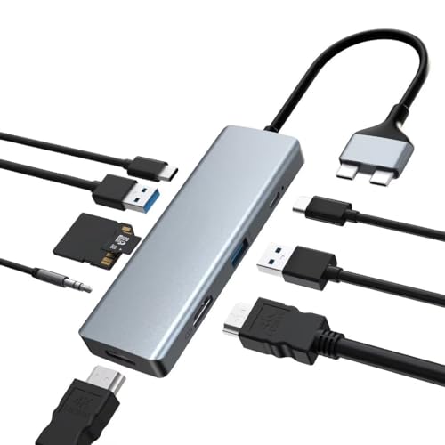 Tymyp 10-i-1 USB C-hub dubbel skärm, USB C till HDMI-hub, USB C-adapter, dockningsstation, 2 x USB 3.0, 2 x USB 2.0, 100 W PD, SD/TF-kortläsare, 3,5 mm ljud, docka med 4K HDMI för iPad, bärbara