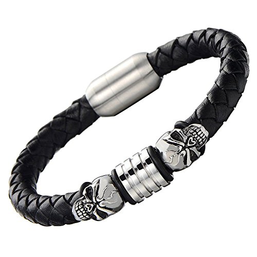 Herrarmband dödskalle för män och män, cool svart läder rostfritt stål skalle armband med magnetlås smycken för ungdomar pojkar pojkar barn halloween födelsedag julklapp, 21 cm, Rostfritt stål