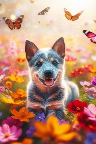Australian Cattle Dog Puppy in a field of colorful flowers Notebook - Large 6 x 9 inches - 127 Pages