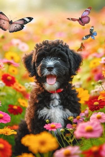 Portuguese Water Dog Puppy in a field of colorful flowers Notebook - Large 6 x 9 inches - 127 Pages