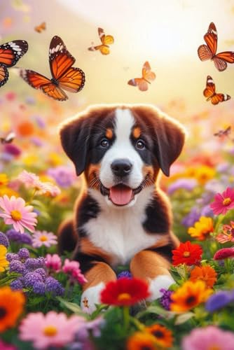 Greater Swiss Mountain Dog Puppy in a field of colorful flowers Notebook - Large 6 x 9 inches - 127 Pages