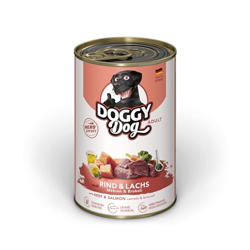 DOGGY Dog Paté nötkött & lax, 6 x 400 g, våtfoder för hundar, spannmålsfritt hundfoder med laxolja och grön läppmussla, komplett mat med morötter och broccoli, tillverkad i Tyskland