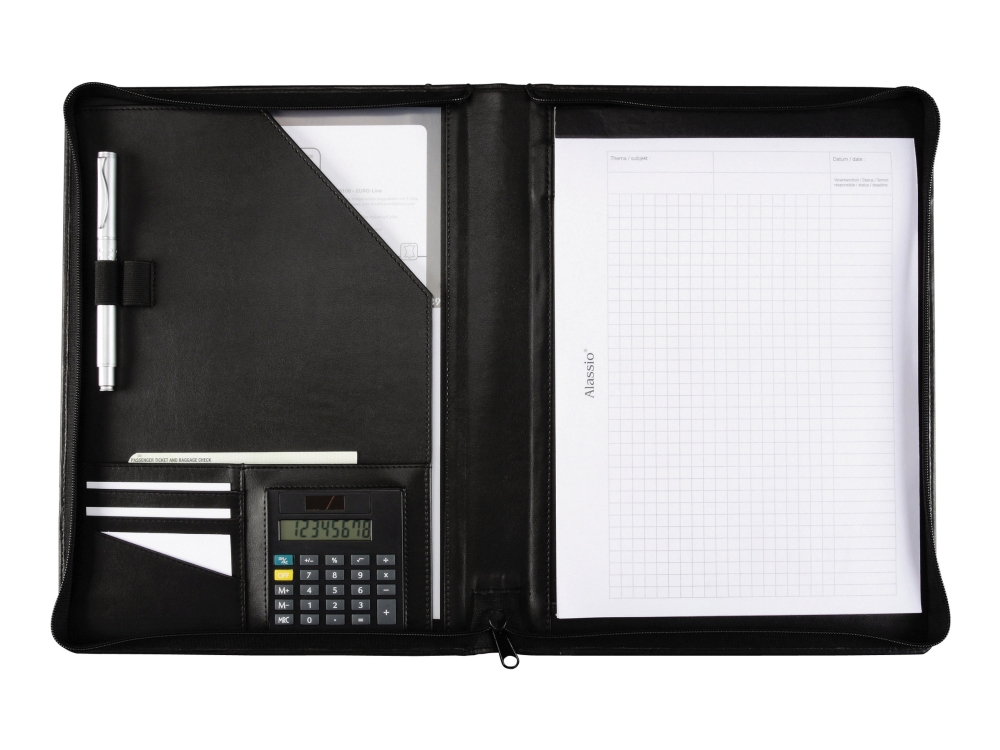 Alassio 43006-1 – skrivmapp A4 CREMONA från nappaläder, dokumentmapp svart, konferensmapp ca 32 x 25 x 2 cm, mapp för A4-dokument, med miniräknare, block A4-och fack