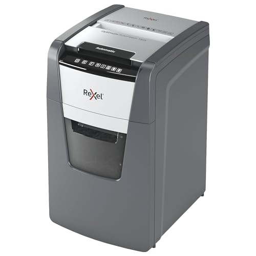 Rexel Optimum AutoFeed+ 150 x automatisk dokumentförstörare, 150 ark automatiskt, säkerhetsnivå P4, partikelskärning, för mindre kontor, 44 liters avfallsbehållare, 2020150XCH