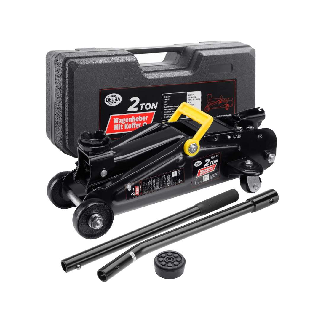 Domkraft hydraulisk 2, 5 ton platt utförande 80–360 mm låg profil inkl. fodral + SUV adapter + 2 x gummidyna, hydraulisk Fordonsdomkraft 360 ° hjul - Bil domkraft, Garagedomkraft, Domkraft för bil