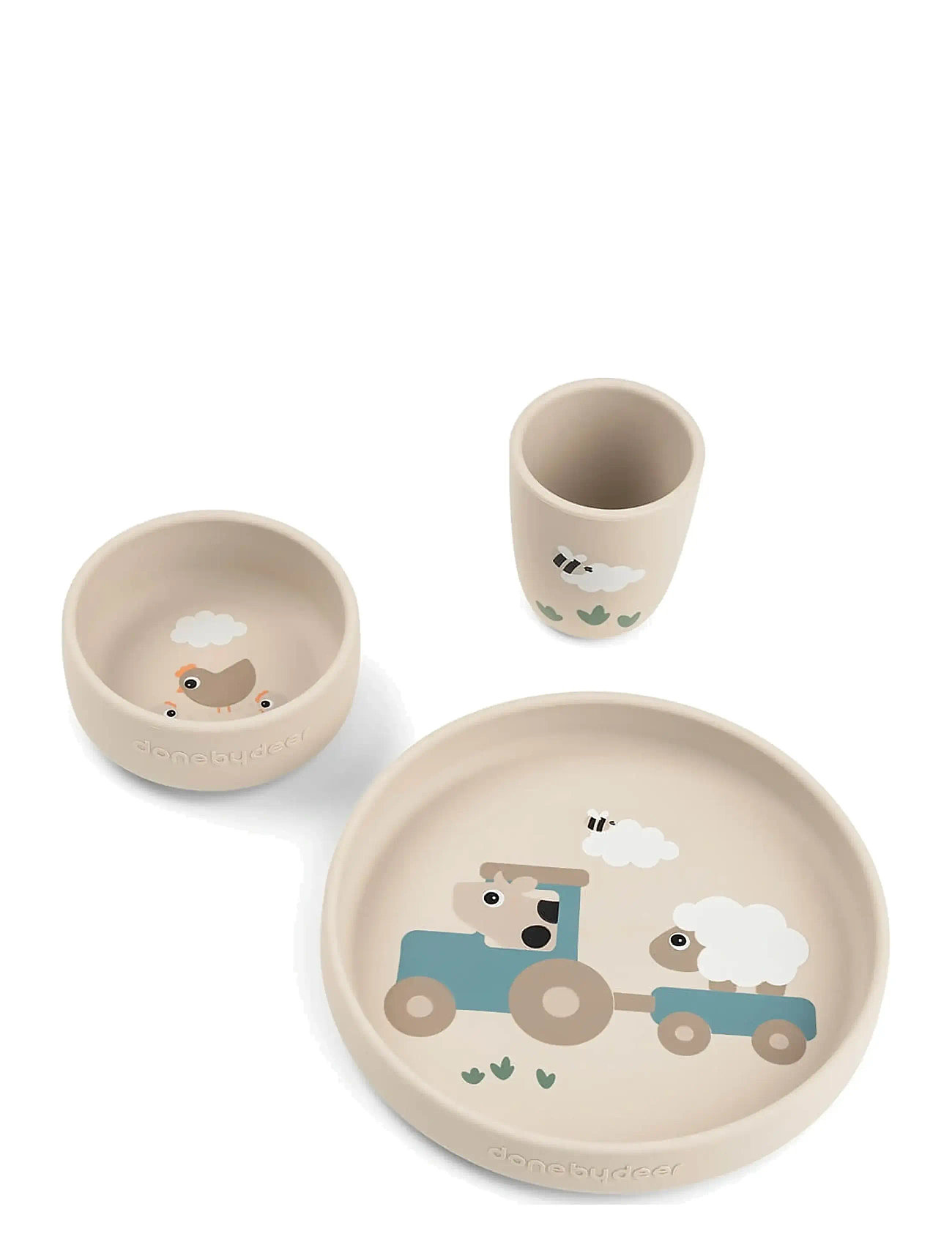 Done by Deer Stick&Stay Dinner Set Tiny Farm Sand - Beige - PLATE:Ø 18X H 3CM.BOWL:Ø 10X H 4CM.MUG:Ø 6.6X H 7.5CM