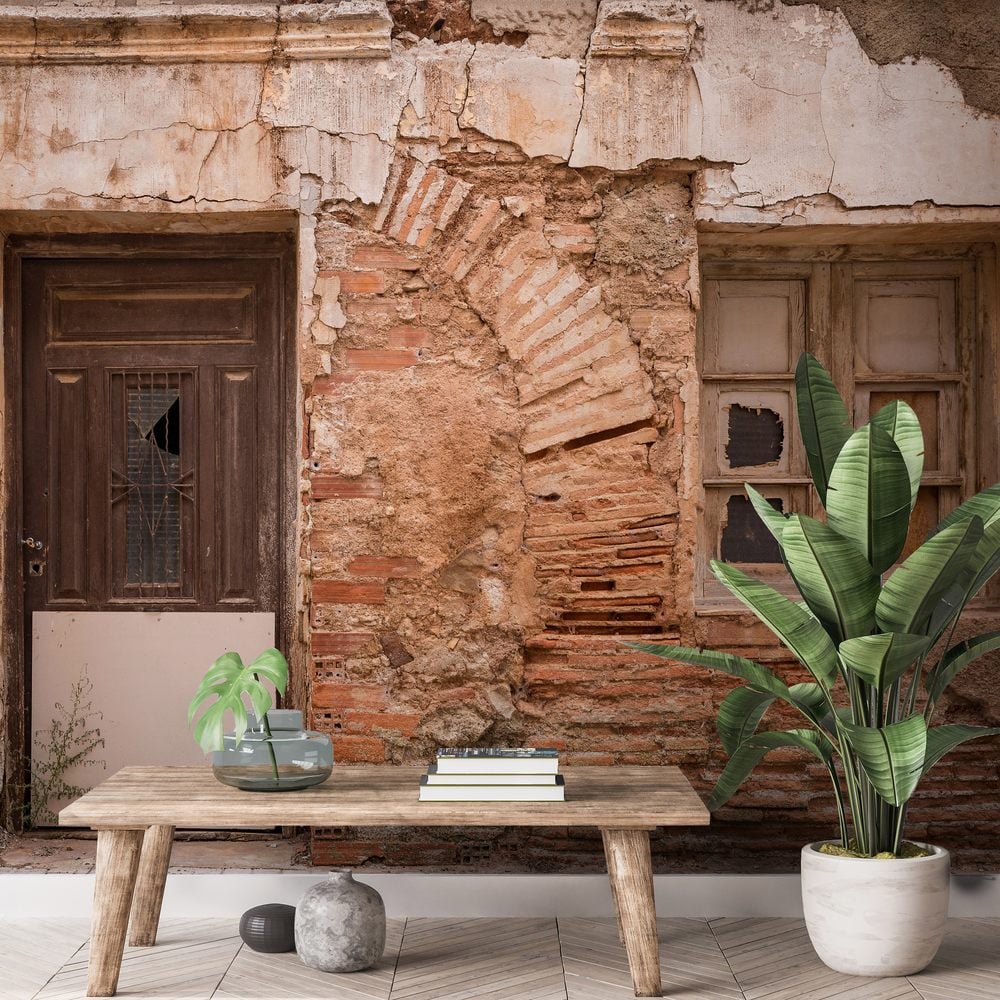 Fototapet -Ancient wooden door and a window on a wall made of bricks - Hall - Scandiwall - Dörr