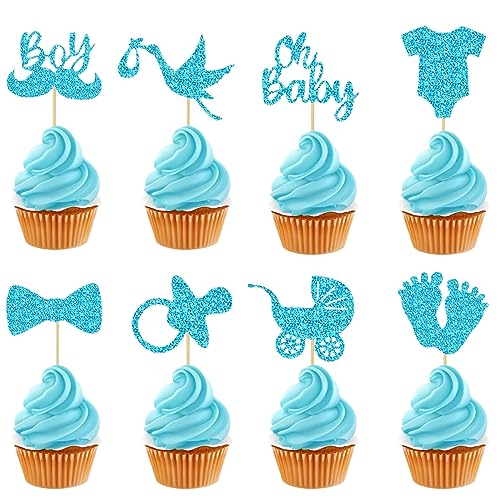 Neodtx It's A Boy cupcake toppers baby 32 stycken babyparty tårtdekoration muffins dekoration pojke eller flicka blå glitter baby shower Åh baby pojke kön reveal party dop dekoration