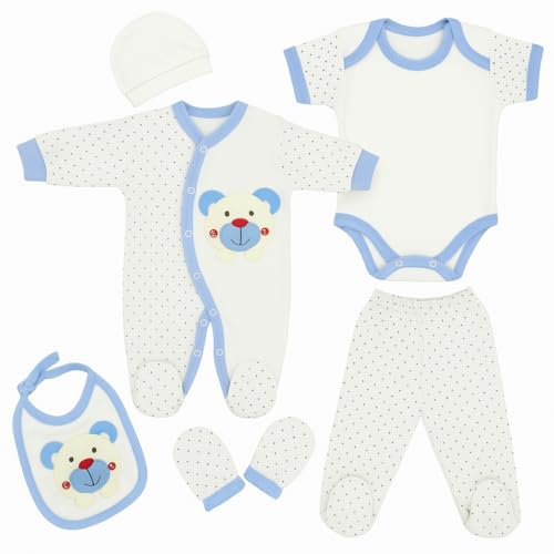 Blue Eyes nyfödd baby presentset unisex | 6 delar första kläder & babyutrustning + bomullsväska | 100 % naturlig OEKO‑TEX® bomull | spädbarn 0–4 månader | present till babyshower & dop (blå)