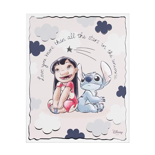 VALENTI & CO. - Disney Lilo och Stitch - tryckt trämålning 38 x 33 cm med silverdetaljer - väggdekorationer, presentidé för nyfödd eller dopgåva för barnrum