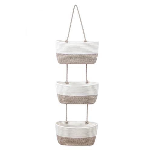 IGTOPS Hängande förvaring, hängande förvaring i 3 nivåer linne arrangör, hängförvaring, väggorganiserare, hängande korg av bomullsrep, vävd dörr- och väggorganiserare (linne)