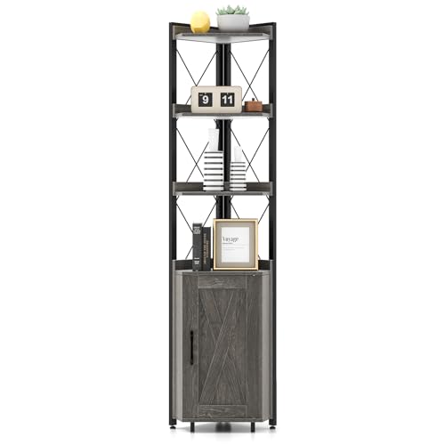Giantex Hörnhylla i 6 nivåer med skåp, 180 cm hög hörnhylla med 5-lägen, justerbar hylla och dörr, fristående förvaring i vardagsrum, kök (grå)