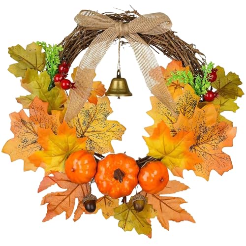 GOMETY Konstgjord höstkrans av lönn, 30 cm, höstkrans, lönnkrans, ytterdörr, fönsterdekoration, lönnblad, dörrkrans för höstdekoration, skördefest, bröllop, halloween, jul, klocka, pumpa, tallkottar