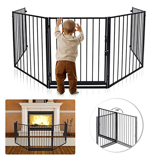 LZQ Kaminskydd med dörr, svart ugnsskyddsgaller 5 delar, total längd 305 cm, dörrskydd, vikbar, avspärrningsgaller lekhage för barn husdjur