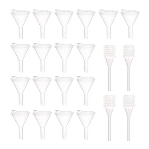 18-pack minitrattar med 4 fjäderdroppar, klar tratt, doseringstratt för kosmetika, eteriska oljor, lotioner, kryddor