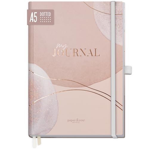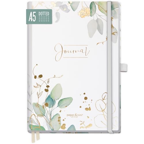 paper&you® Premium Journal dotted A5 "Bladguld" prickad anteckningsbok, 120g/m² tjockt papper, 188 numrerade sidor, dagbok med prickat rutnät - hållbar & klimatvänlig