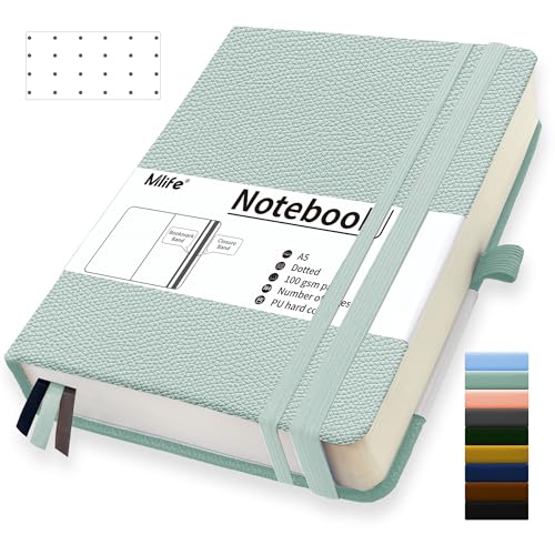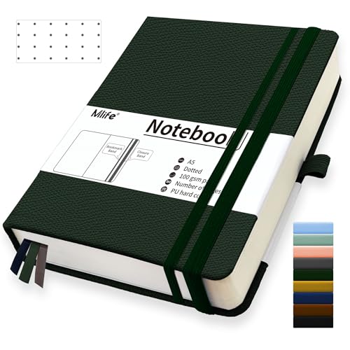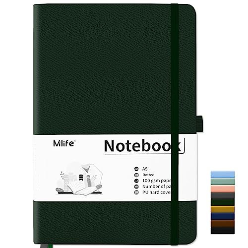 Mlife A5 Dotted Notebook, Anteckningsbok med 200 Sidor, Tjockt 100 G/M² Bläckbeständigt Papper, Anteckningsbok med Pu-Hårt Omslag, Innerficka, Elastiskt Band, Bullet Journal & Dagbok (grön)
