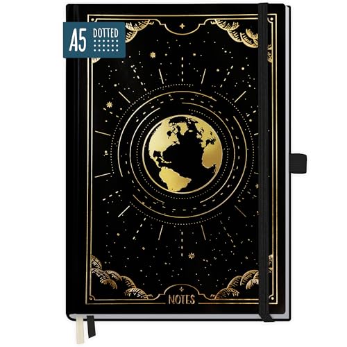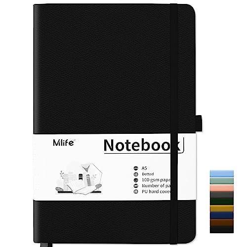 Mlife A5 Dotted Notebook, Anteckningsbok med 200 Sidor, Tjockt 100 G/M² Bläckbeständigt Papper, Anteckningsbok med Pu-Hårt Omslag, Innerficka, Elastiskt Band, Bullet Journal & Dagbok (Svart)
