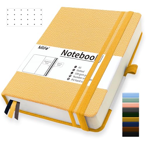 Mlife A5 Dotted Notebook, Anteckningsbok med 200 Sidor, Tjockt 100 G/M² Bläckbeständigt Papper, Anteckningsbok med Pu-Hårt Omslag, Innerficka, Elastiskt Band, Bullet Journal & Dagbok (gul)