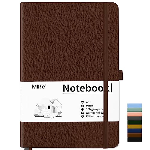 Mlife A5 Dotted Notebook, Anteckningsbok med 200 Sidor, Tjockt 100 G/M² Bläckbeständigt Papper, Anteckningsbok med Pu-Hårt Omslag, Innerficka, Elastiskt Band, Bullet Journal & Dagbok (brun)