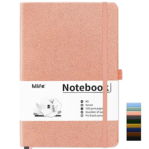 Mlife A5 Dotted Notebook, Anteckningsbok med 200 Sidor, Tjockt 100 G/M² Bläckbeständigt Papper, Anteckningsbok med Pu-Hårt Omslag, Innerficka, Elastiskt Band, Bullet Journal & Dagbok (rosa)
