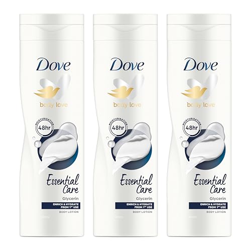 Dove Body Love Essential Care Body Lotion återfuktande hudkräm med glycerin för näring och återfuktning av huden redan vid första användning 3 x 400 ml