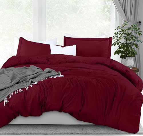 Utopia Sängkläder påslakan queen size – 1 påslakan med 2 örngott – 3 delar sängkläder täcke med dragkedja – mjukt borstad mikrofiber, 23 x 230 cm (drottning, vinröd)